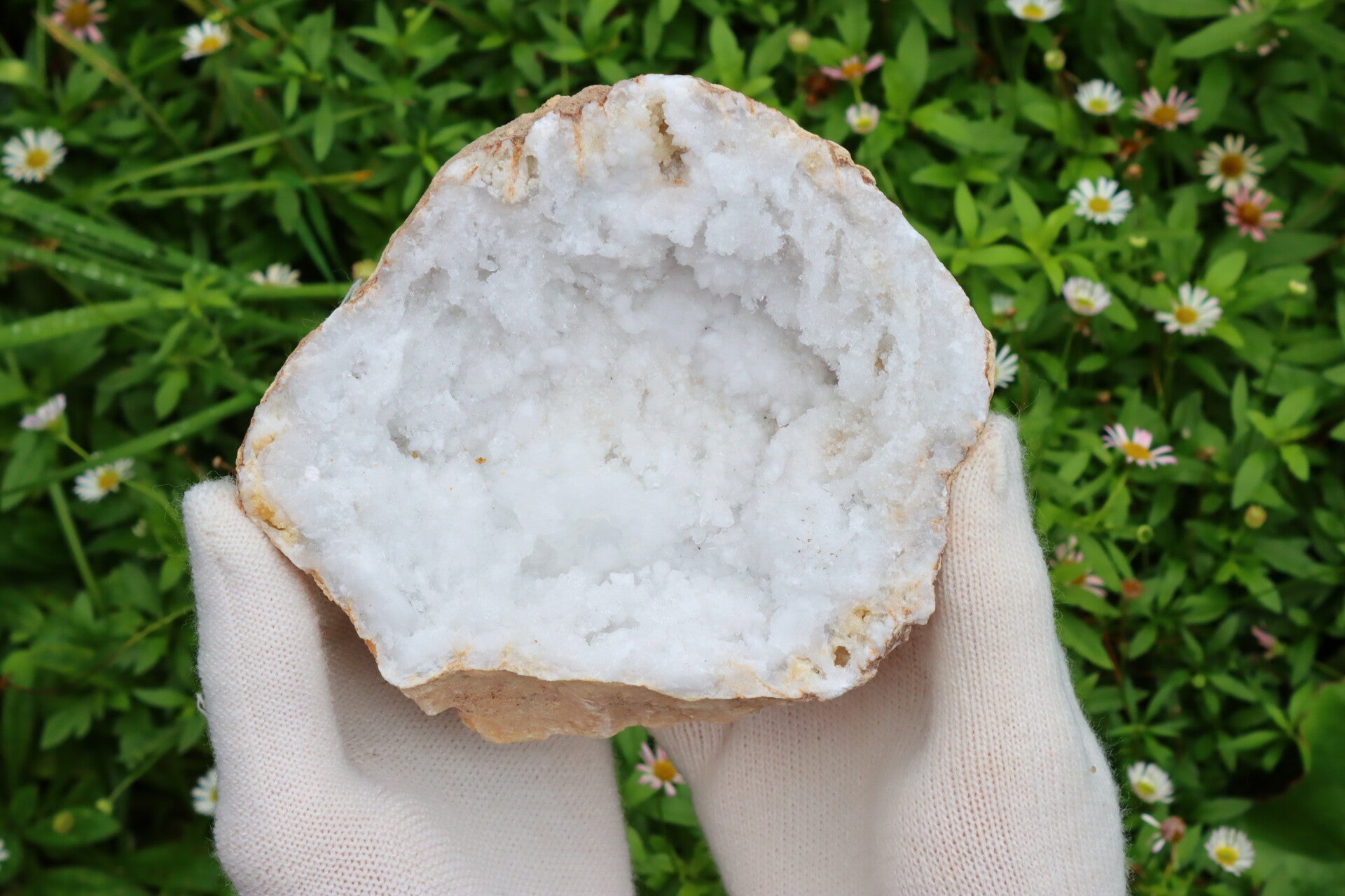 Dit is een mooie, grote Bergkristal Geode (Kwarts). De buitenkant is ruw en natuurlijk, wat de geode een authentieke uitstraling geeft.
