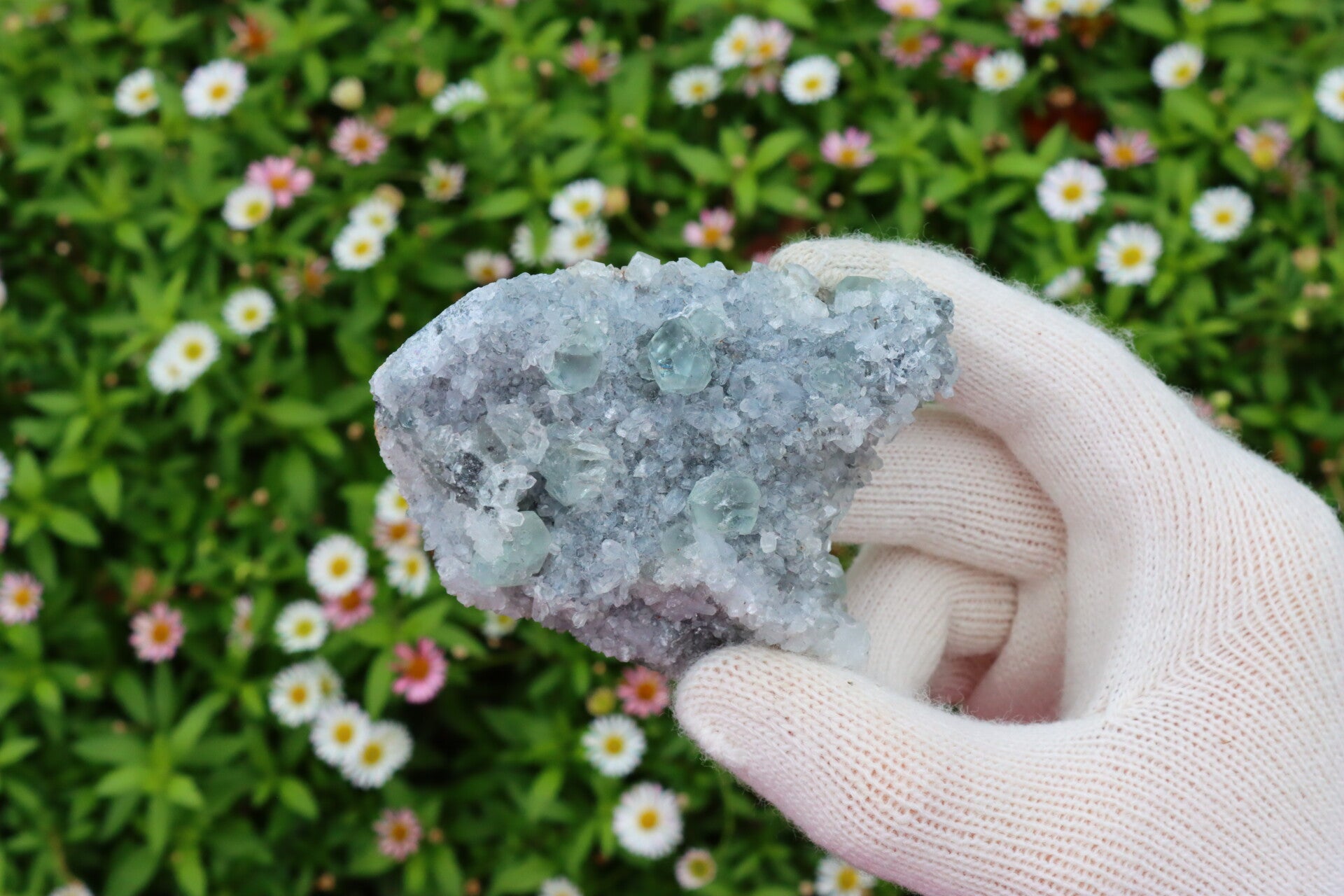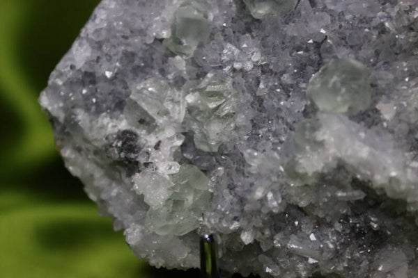 Het mineraal heeft een ruwe, natuurlijke basis die contrasteert met de sprankelende en subtiele druzy. Door de zachte en koele kleuren is dit een rustgevende en elegante toevoeging aan elke verzameling.