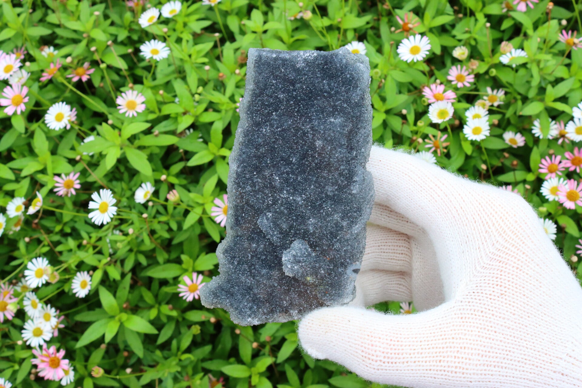 Het oppervlak is volledig bedekt met een dichte druzy van Kwarts, wat resulteert in een fluweelachtige textuur en een subtiele glans. De kleur is een diepe, rokerige tint die varieert van donkergrijs tot zwartblauw.
