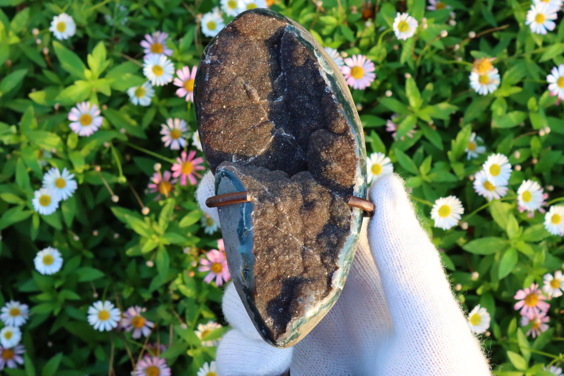 Hij heeft een ruwe, natuurlijke buitenkant en een intrigerende binnenkant met kristalstructuren die deze ongebruikelijke kleur tonen. De herkomst uit Uruguay garandeert een hoge kwaliteit, ook in deze zeldzame variant.