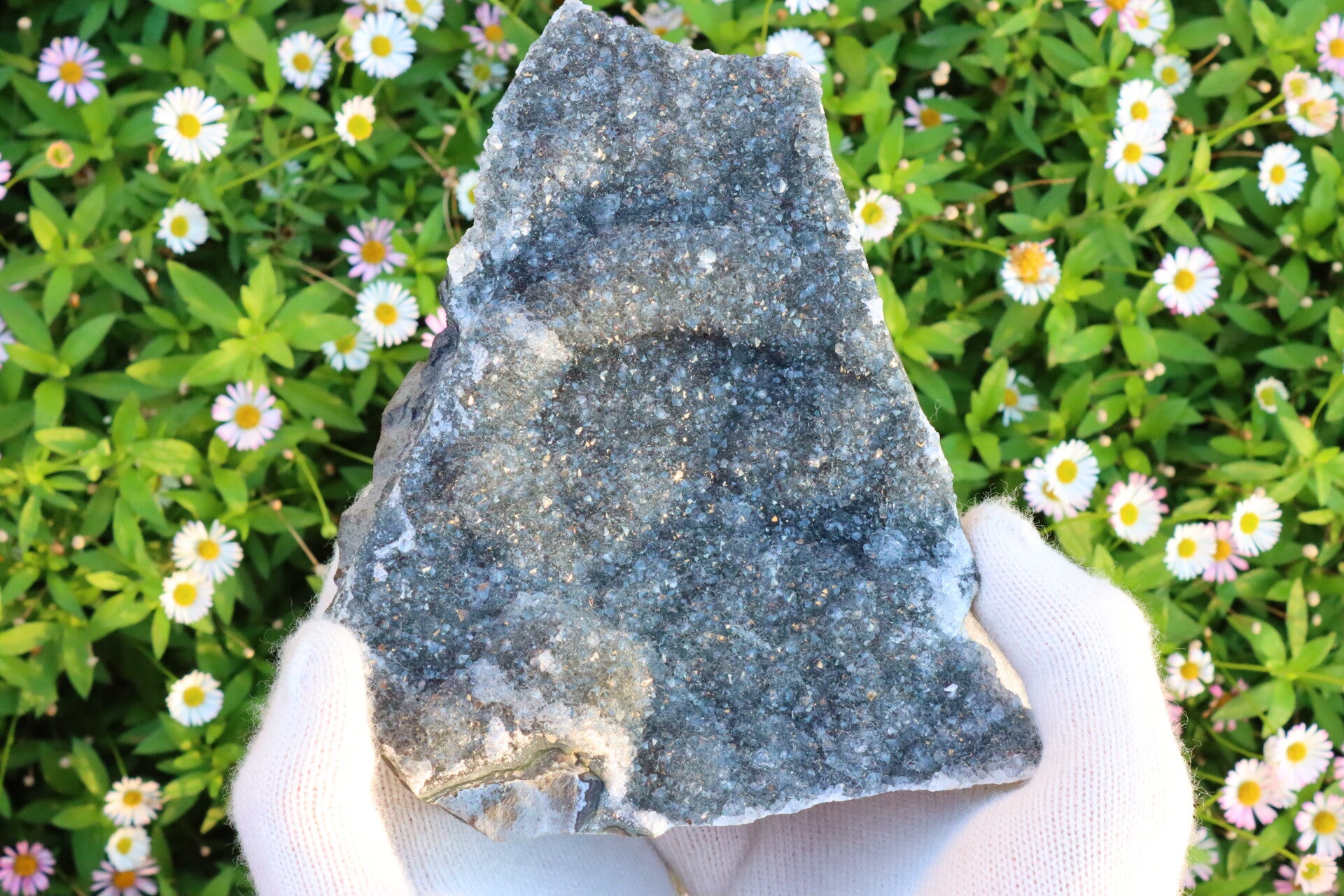Hij is voorzien van een standvlak, waardoor hij perfect zelfstandig kan staan en gemakkelijk op een boekenplank of tafel kan worden geplaatst. De kristallen op het oppervlak vormen een dichte en glanzende druze, wat het stuk een sprankelende en verfijnde textuur geeft.