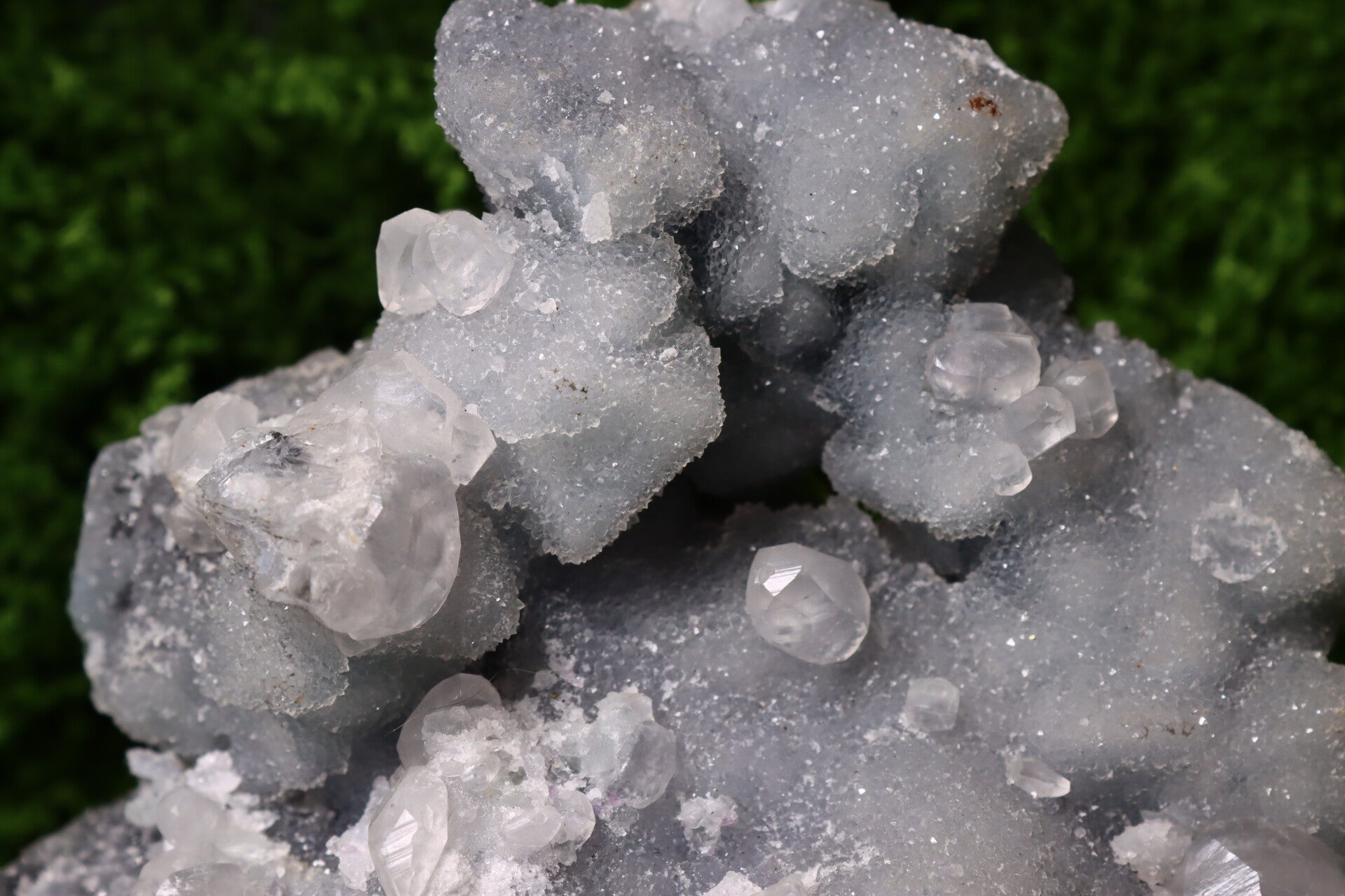 De basis bestaat uit botryoïdale Fluoriet die volledig bedekt is met een glinsterende laag Druzy Kwarts. Bovenop dit complex liggen prachtige oranje Calciet kristallen.