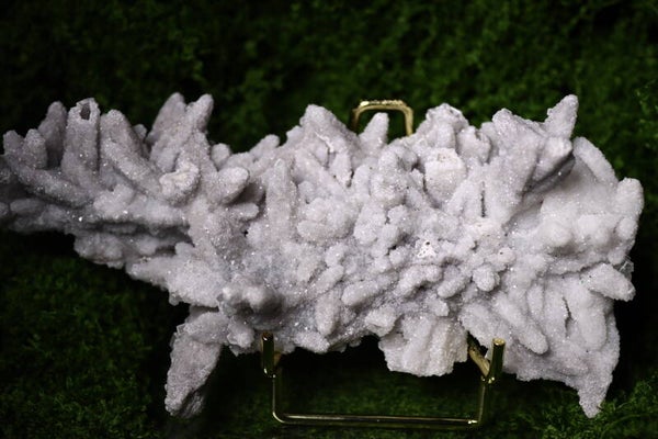 De structuur, die doet denken aan een wit gewei of koraal, is een buisvormige groei van Chalcedoon/Calciet die is bedekt met een prachtig glinsterende Druzy Kwarts laag.