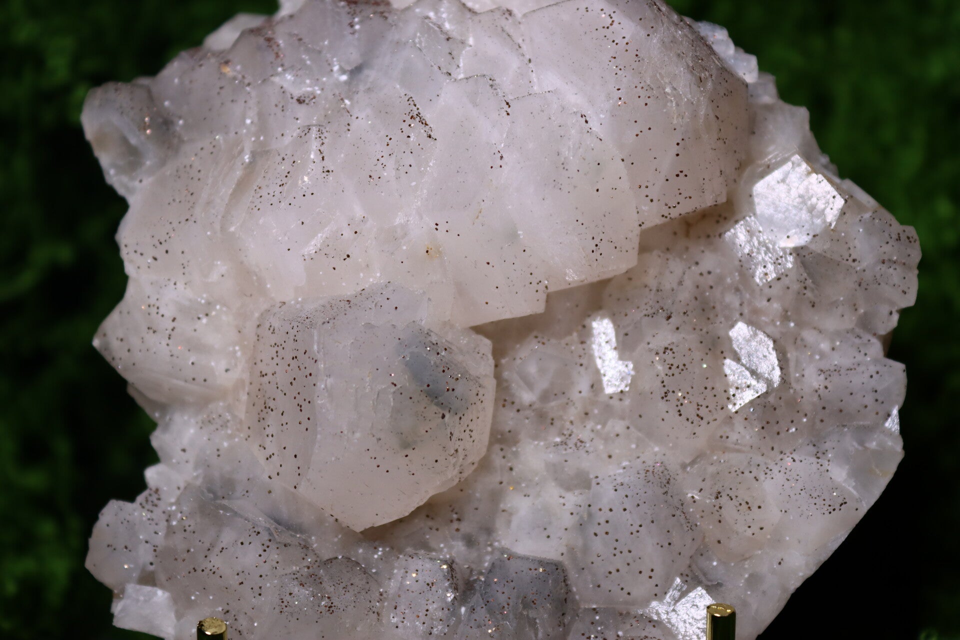 Dit specimen combineert grote, heldere Calciet kristallen met een unieke esthetiek: de calcietoppervlakken zijn bezaaid met duizenden kleine, donkere Sphaleriet kristallen die een prachtig glitter effect geven.