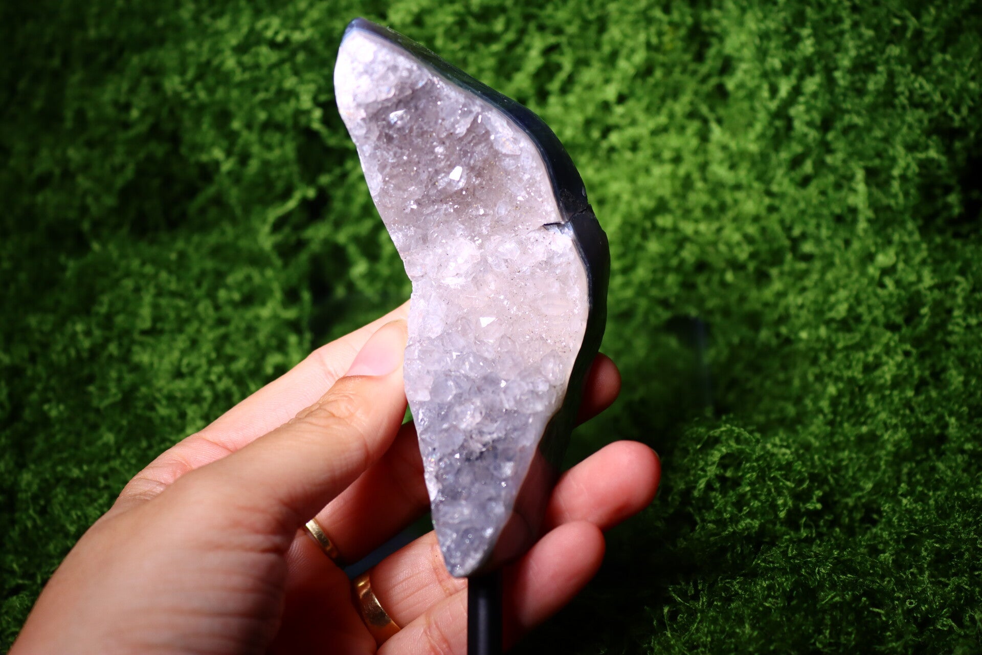 Heel mooi stukje amethist op standaard, hij heeft een kleine scheur en is daarom ook erg afgeprijst! Desondanks dit, heeft hij nog steeds super glanzende amethist kristallen.